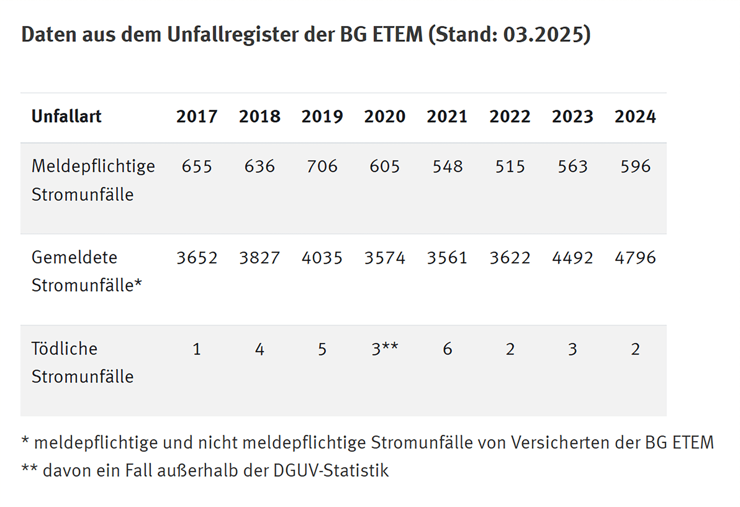 Die aktuelle Unfallstatistik zeigt ein klares Bild. Positiv zu erwähnen ist, dass die Zahl der tödlichen Unfälle mit Strom immer weiter zurückgeht. Das ist sehr erfreulich, aber Stromunfälle im Niederspannungsbereich sind nach wie vor ein wichtiges Thema und sie betreffen überwiegend ganz alltägliche Arbeiten.