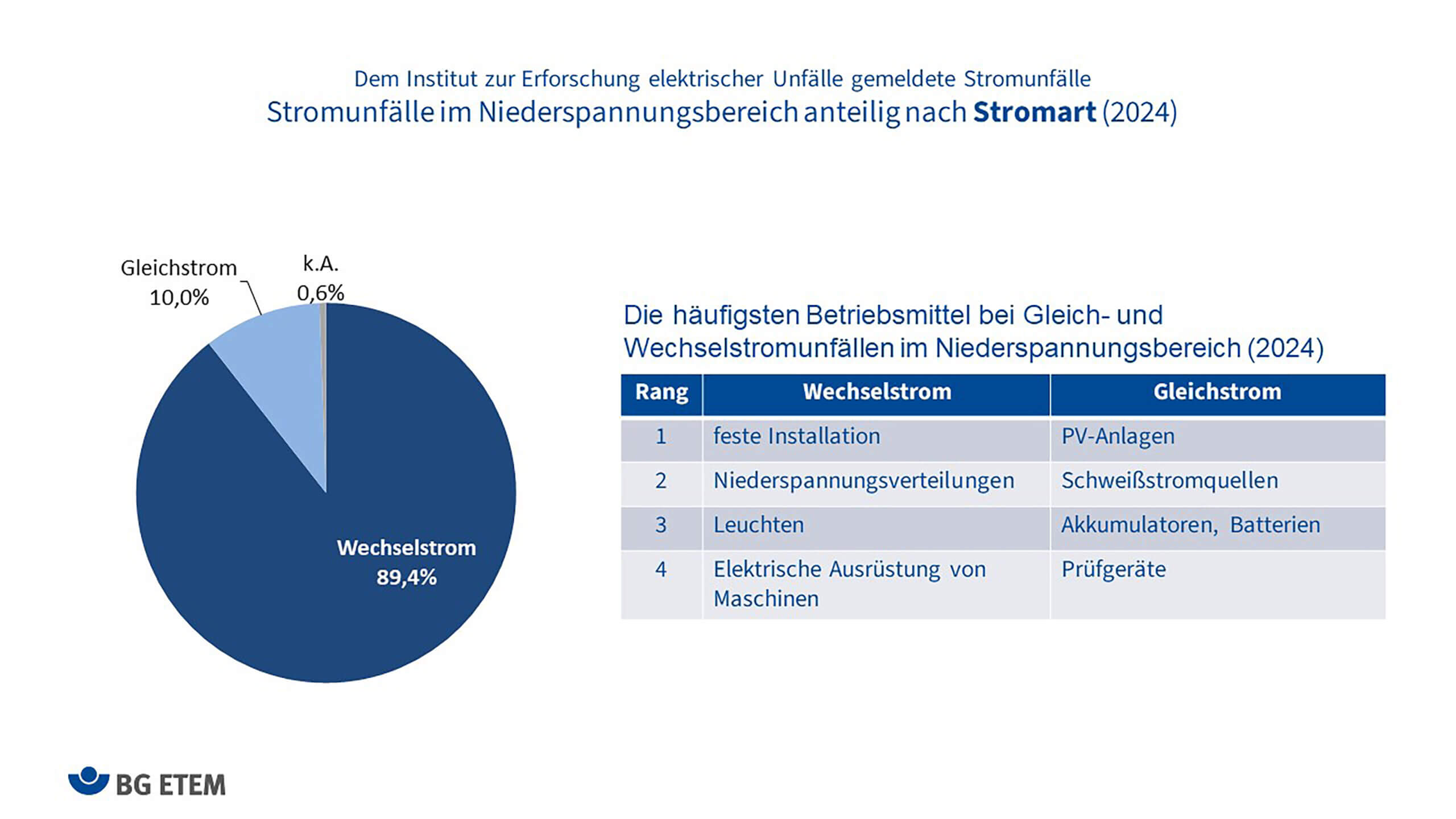 Ein Blick auf die Verteilung zeigt es sofort: Bei einem Unfall ist Wechselstrom mit 89,4 % aller Fälle die dominierende Art des Stroms.