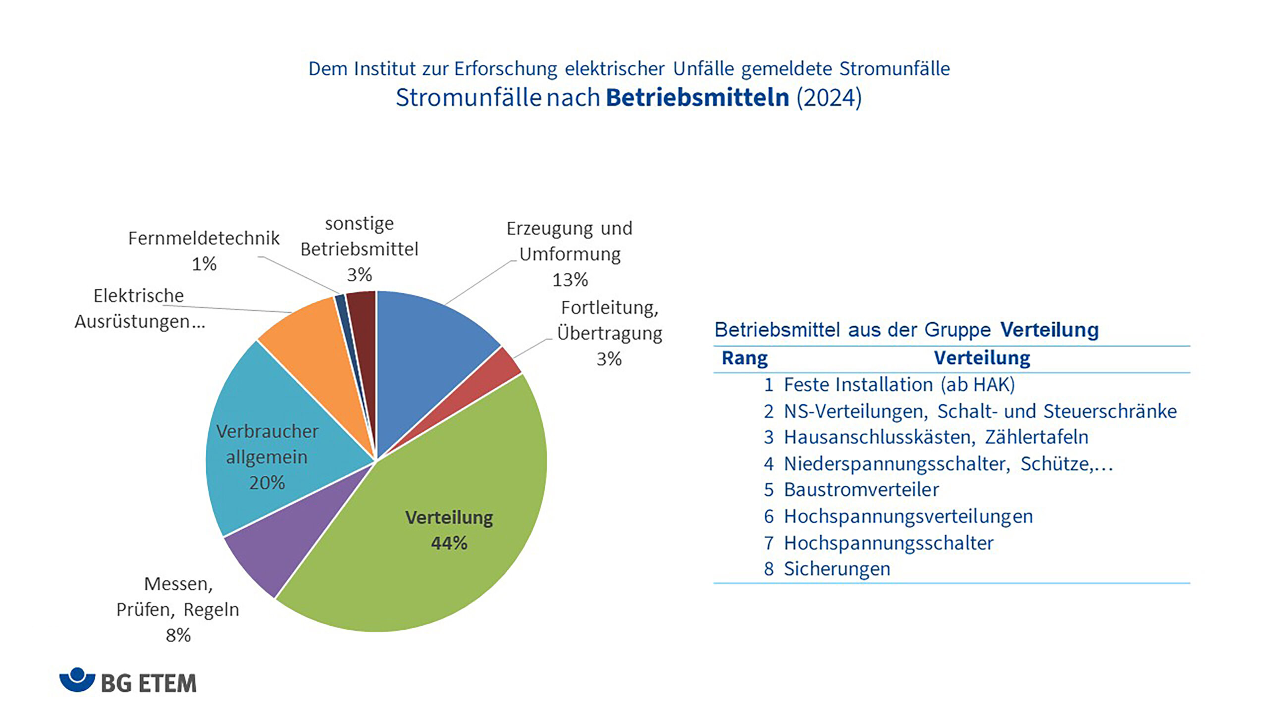 Die nachstehende Statistik macht das Bild noch schärfer: 44 % aller Stromunfälle entstehen im Bereich der Verteilung. Damit ist dieser Bereich mit weitem Abstand Spitzenreiter.